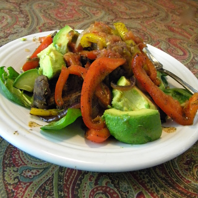 Serve the fajita mixture over a bed of lettuce and top with desired ingredients.